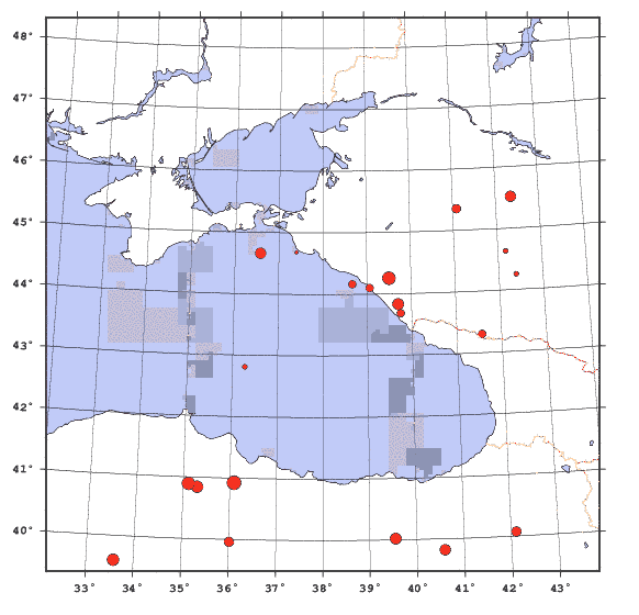 20 землетрясений, зарегистрированных в районе [широта 44.00, долгота 38.00, радиус 500 км]