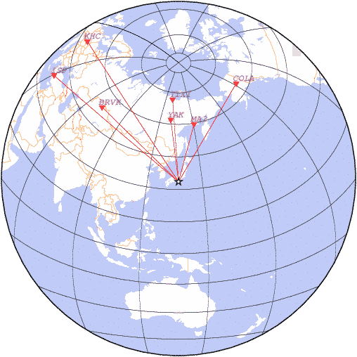 Параметры землетрясения в районе Южное побережье Западного РҐРѕРЅСЃСЋ, время 2004-09-05 18:13:48, широта 33.52, долгота 136.98, глубина 33 км, mb: 5.0/4 рассчитаны по станциям: