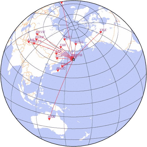 Параметры землетрясения в районе Восточнее Курильских островов, время 2019-03-29 01:29:33, широта 50.67, долгота 159.99, глубина 10 км, mb: 4.4/8 рассчитаны по станциям: