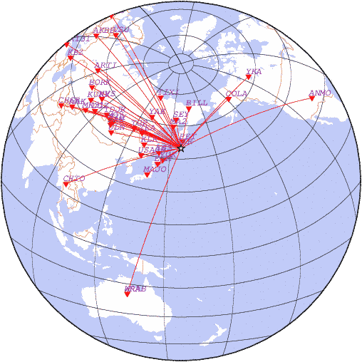 Параметры землетрясения в районе Восточнее Курильских островов, время 2025-07-30 15:44:20, широта 49.83, долгота 157.36, глубина 10 км, mb: 5.2/26 рассчитаны по станциям: