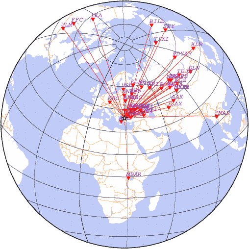 Параметры землетрясения в районе Турция, время 2025-10-28 07:54:14, широта 39.20, долгота 28.21, глубина 10 км, mb: 4.9/22 рассчитаны по станциям: