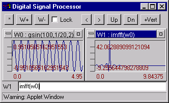 Digital Signal Processor functions list.abs atan ceil conv deriv exp extract floor gcos gline gsin hanning imfft integ kaiser linreg log10 log max mean min refft rand spectrum sqrt tan abs(W) - Produces the absolute value of any expression. Example atan(W) - Calculates the arc-tangent of any expression ceil(W) - Finds the smallest integer greater than or equal to the input value. conv(W1, W2) -Convolves two signal W1 and W2. Example deriv(W) - Derivative of signal W. Calculates by 3 points. exp(W) - e**W (e=2.71828...) extract(W, start, length) - Makes a new signal by extracting a portion of another signal. Example floor(W) - Finds the greatest integer less or equal to the input value. gcos(points, spacing[, n [, j ]]) - Generates a cosine curve cos(2*p *n *t+j ). Example gline(points, spacing, a, b) - Generates a line y=a*t+b. Example gsin(points, spacing[, n [, j ]]) - Generates a sine curve sin(2*p *n *t+j ). Example hanning(W) - Multiplies a signal by Hanning Window 0.5*(1.-cos(2*p *i/(nn-1))). Warning: W padding zeros to signal length will be power of 2. Example imfft(W) - Imaginary part of the first half of the FFT of the W. W padding zeros to signal length will be power of 2. integ(W)- - Calculates the integral of the W. Example kaiser(W[, b ]) - Multiplies a signal by Kaiser window. W padding zeros to signal length will be power of 2. Example linreg(W) - Determines the best linear fit to a signal. Returns generated line. Example log10(W) - Calculates the based 10 logarithm of the W. log(W) - Calculates the natural logarithm of the W. max(W) - Finds maximum value of the W. mean(W) - Finds the mean value of the W. Example min(W) - Finds minimum value of the W. rand(points, spacing) Generates points pseudorandom numbers between 0.0 and 1.0. Example refft(W) - Real part of the first half of the FFT of W. W padding by zeros to signal length will be power of 2.Example spectrum(W) - Returns the magnitude of the first half of the FFT of a signal. W padding by zeros to signal length will be power of 2. Example sqrt(W) - Calculates the square root of the W. tan(W) - Calculates the tangent W. Buttons .[*] - Apply formula (Calculate formula in active Window). Equivalent pressing enter key. [W+] - Add new window. [W-] - Remove active window. [Lock] - lock window to protect data associated with active Window from changing. Disable formula editing element. [>] - Scroll window right. [<] - Scroll window left. [Up] - Scroll window up. [Dn] - Scroll window down. [+Vert] - Expand vertical. [-Vert] - Compress vertical. [+Horz] - Expand horizontal. [-Horz] - Compress horizontal. [#] - Fit graphic to window [Copy] - Copy data from active window to Data Exchange Board. [Paste] - Paste data from Data Exchange Board to active window. [Import] - Run dialog box where you can enter your own new data in the ascii format or edit existing data associated with current active window.